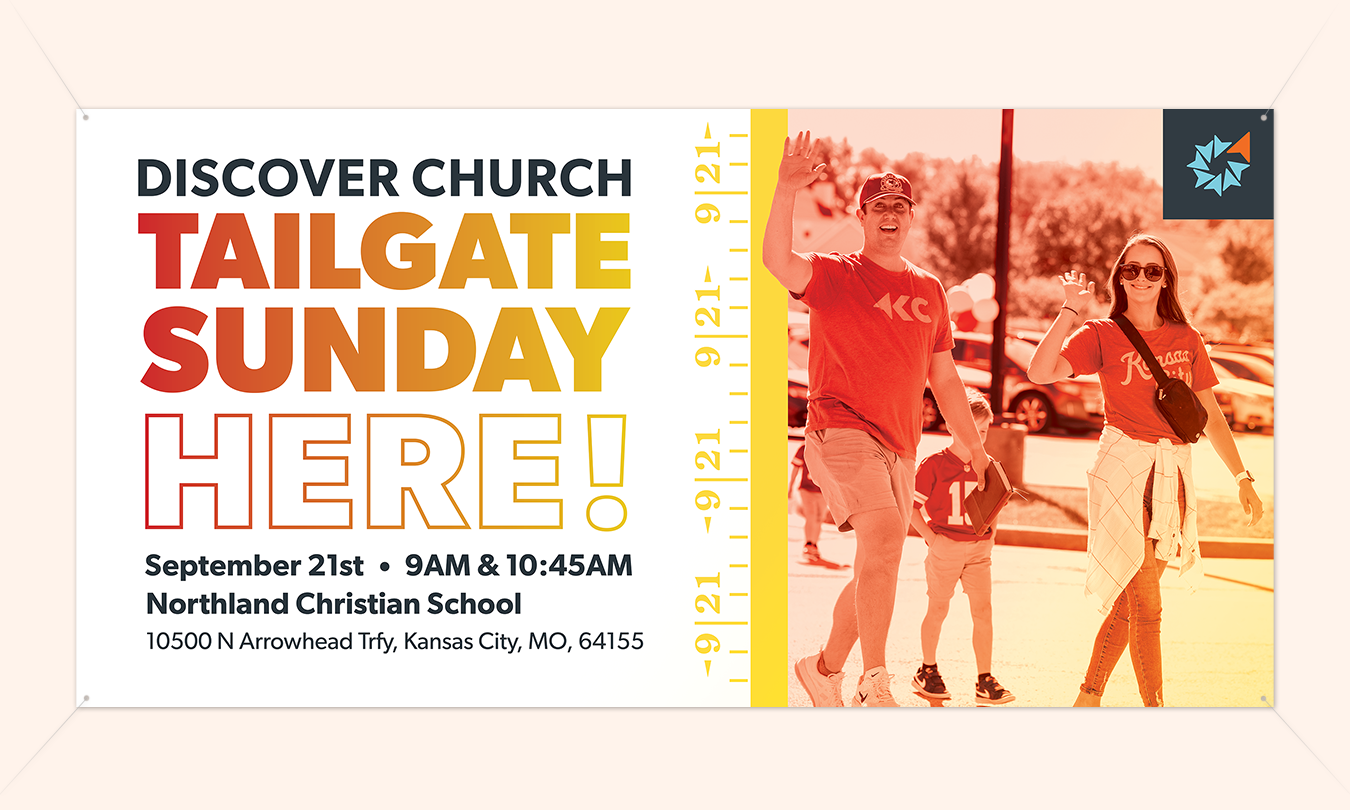 Promotional campaign for Discover Church's Tailgate Sunday event to rally the community around it's hometown football team.