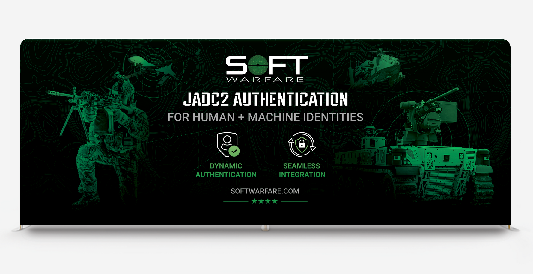 The goal was to capture SOFTwarfare's JADC2 capabilities while capturing the attention of attendees at the trade show. Being a small company, SOFTwarfare wanted to showcase the capabilities with large, impactful visuals that would stand out amongst the other vendors. I was tasked with creating all new backdrops and collateral for SOFTwarfare's 20' x 20' booth space. These included a 20' x 8' cloth backdrop, a kiosk banner, podium skirt, printed overviews, stickers and social posts.