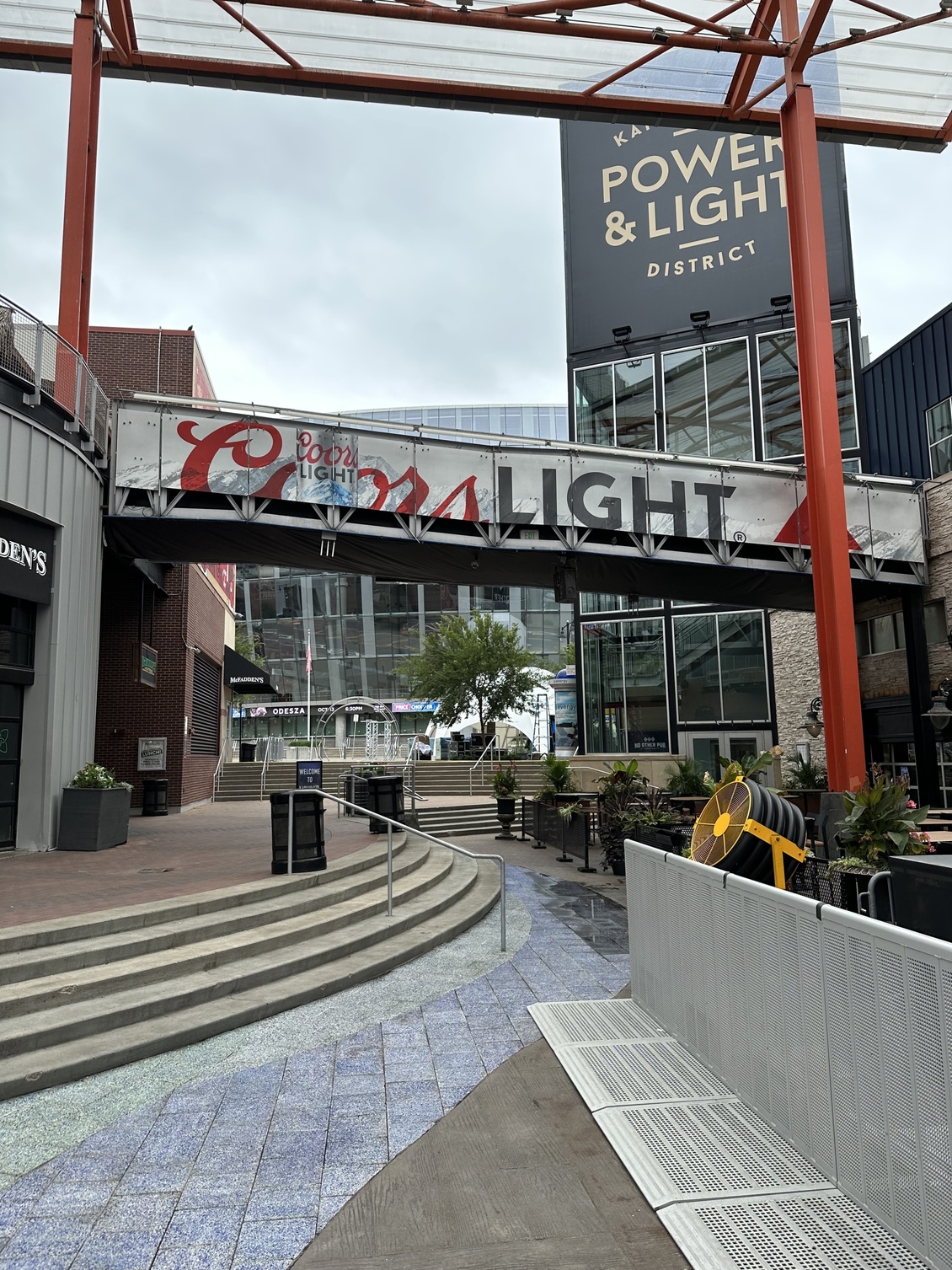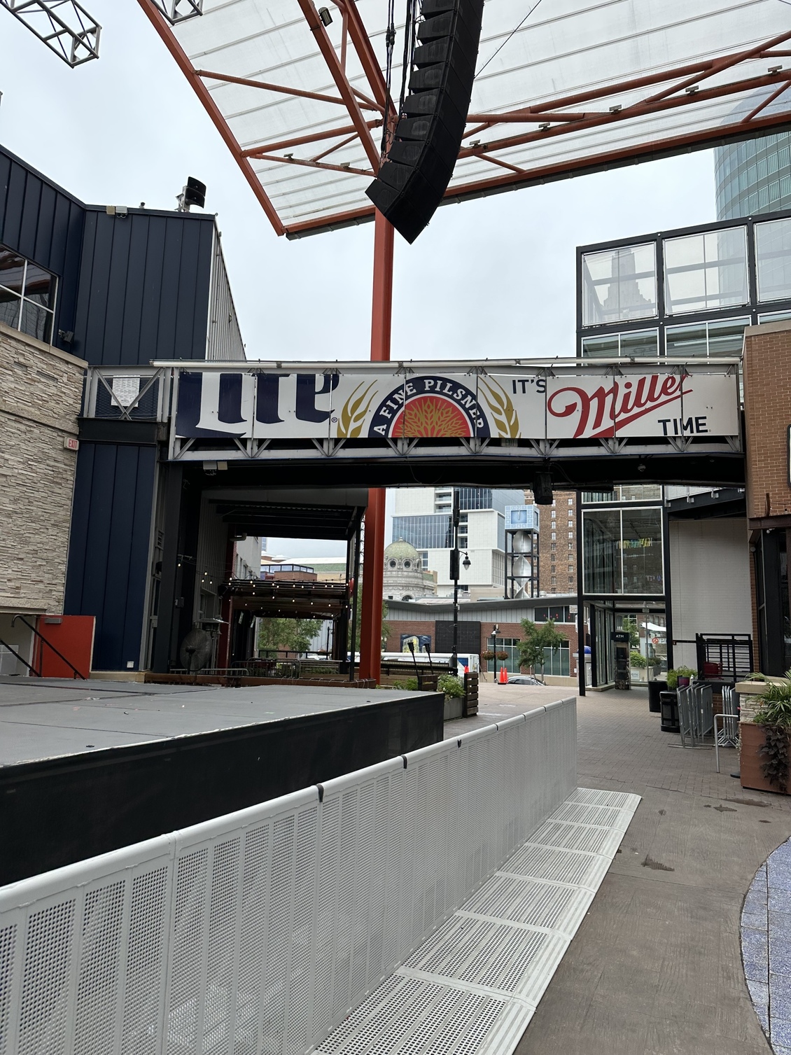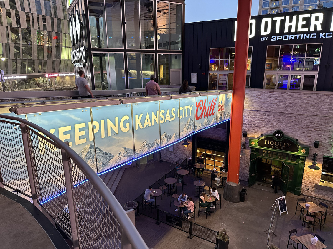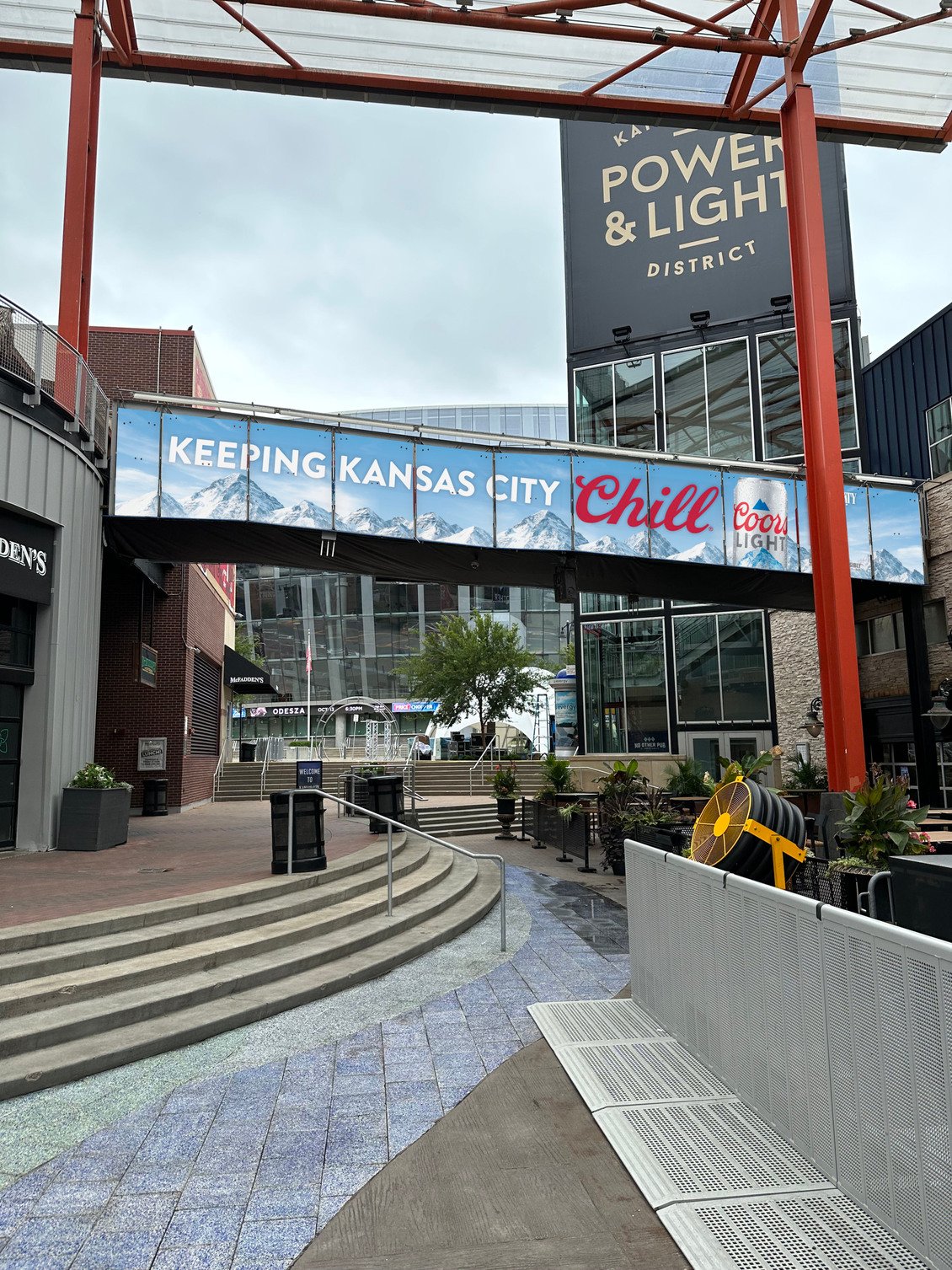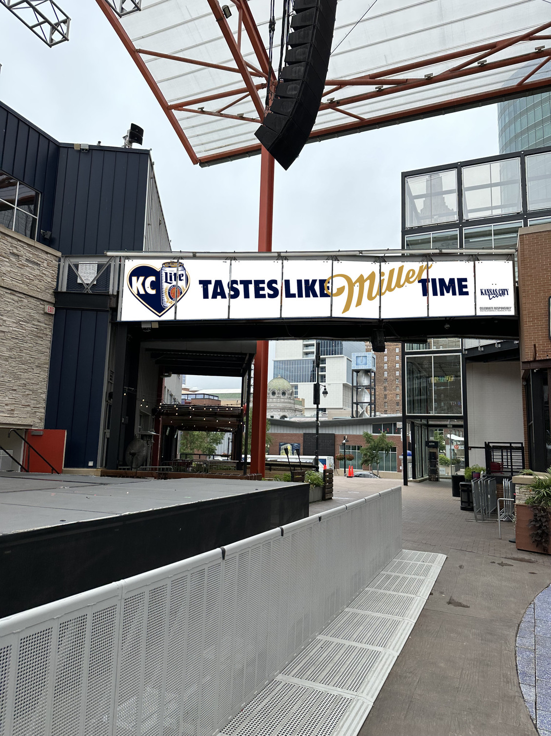 The KC Live! event space within Kansas City's Power & Light district features a plethora of signage. Two of the largest pieces in the area are attached to two, 25 foot wide catwalks on either side of the facility. The district facilities director wanted to update the 15 year old signage in an effort to freshen up the visuals and cover large gaps underneath the panels prior to the NCAA Wrestling Championships in March.